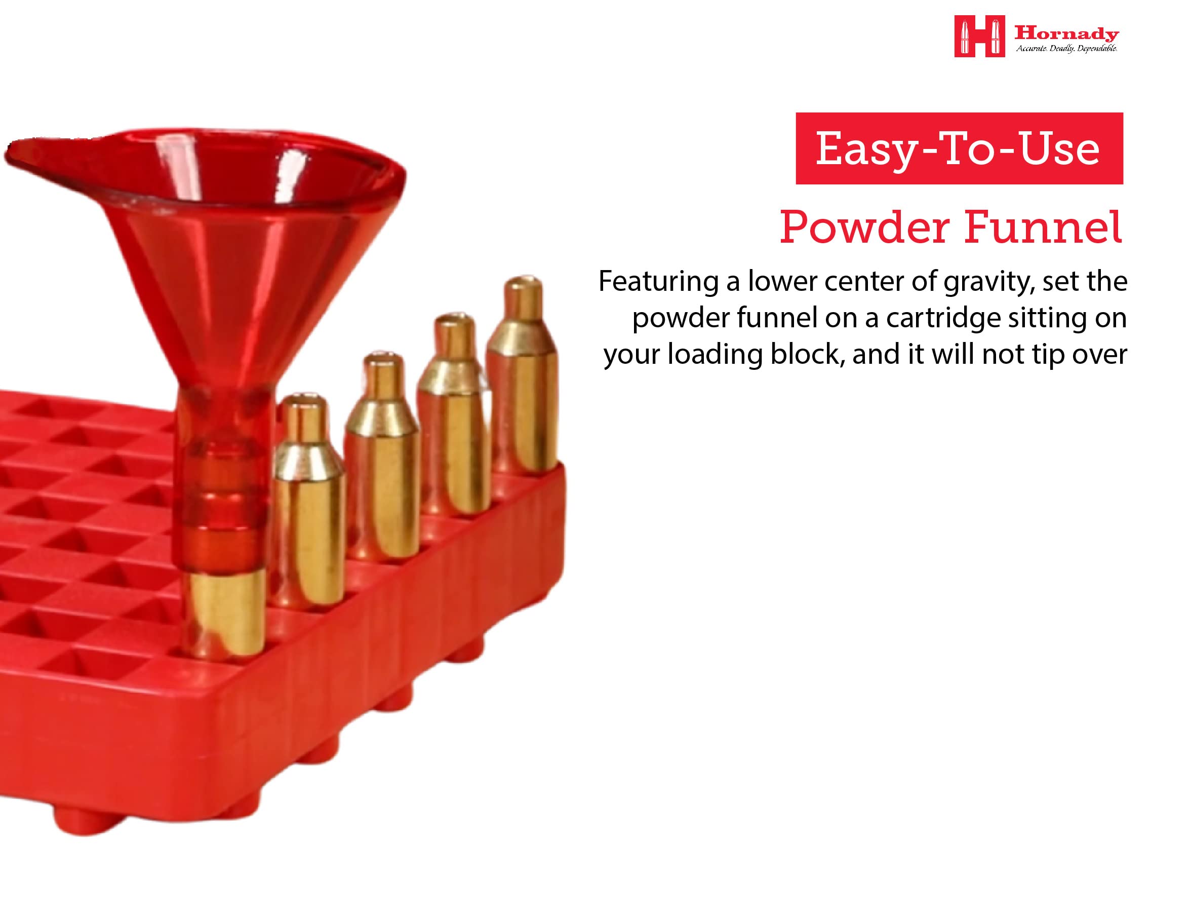 - Perfect Addition to Your Reloading Bench - the Hornady Basic Powder Funnel 586051 is an anti-static gun powder funnel that fits all calibers between .22 and .45 to help you save time and improve reloading accuracy and efficiency when handloading your own ammunition