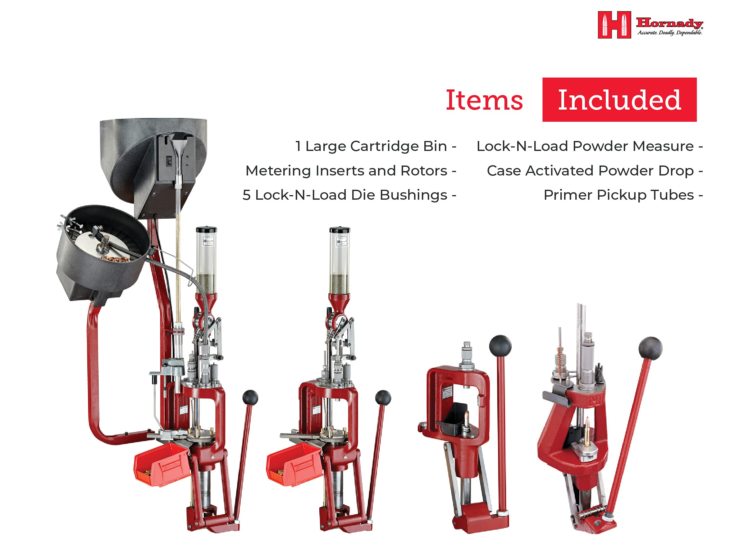 - Lock-N-Load Auto Progressive Reloading Press – Reload up to 500 rounds per hour with this professional grade, auto indexing, 5 station progressive press that features the patented Lock-N-Load bushing system. This must-have Hornady reloading equipment is intuitive and well equipped for all your reloading needs