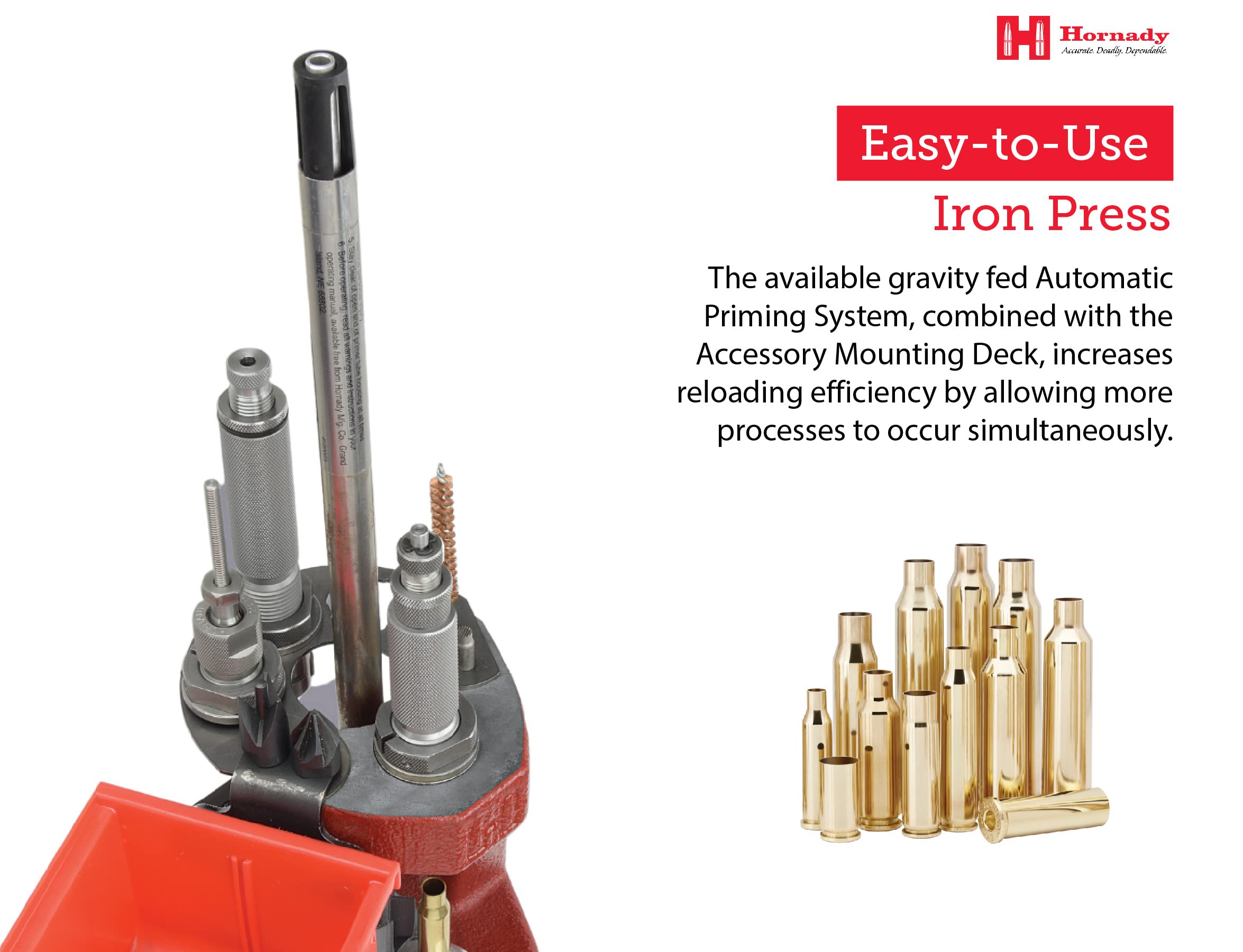 - Reliability - With a heavy duty, fully ambidextrous, cast iron frame, the Iron Press is built to be the heaviest, most rigid press in its class. The Iron Press is the first of its kind to allow the ability to deprime, pause and remove the case to chamfer & deburr etc., then replace and prime.