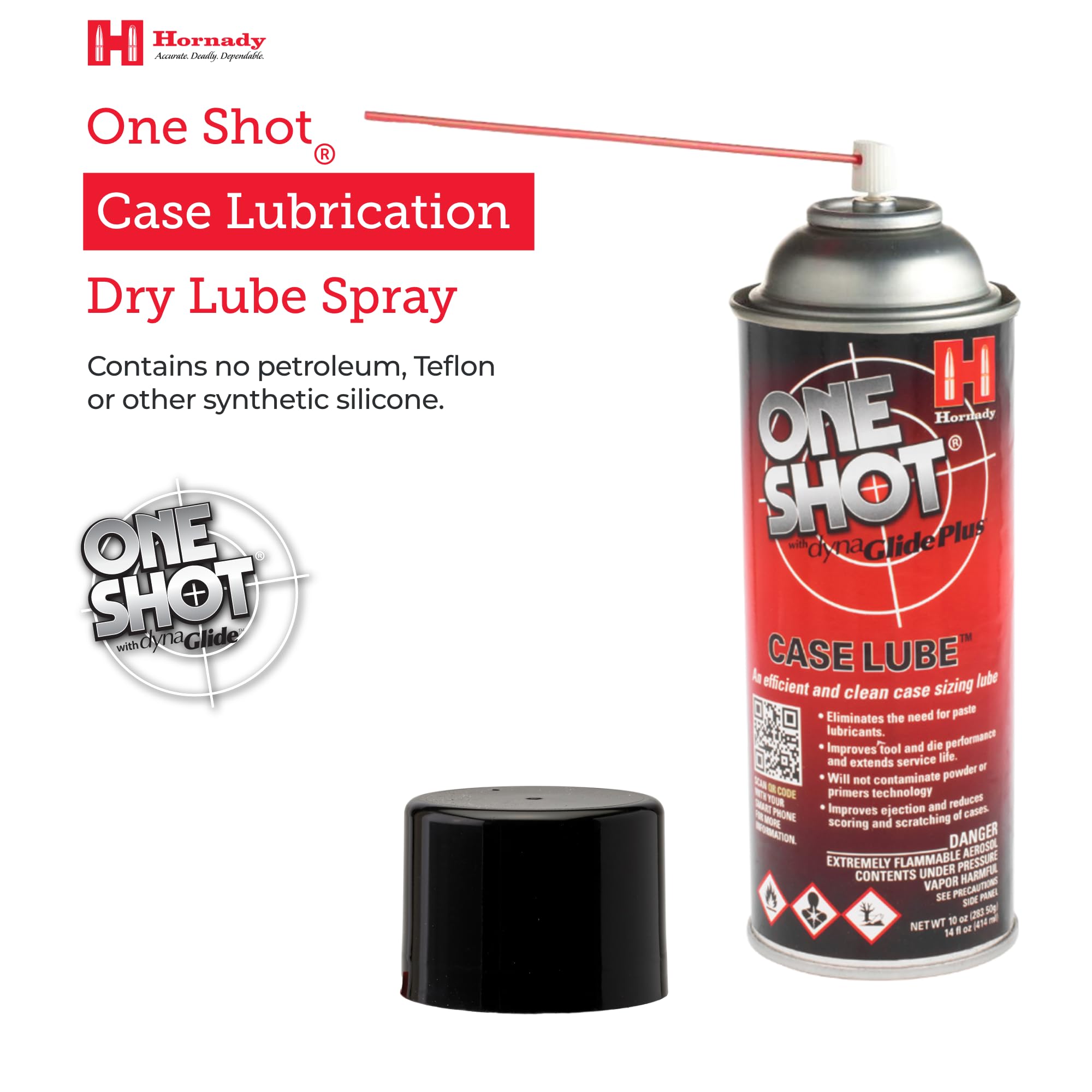 - Hornady One Shot Case Lube – Our Hornady Case Lube Spray with DynaGlide Plus technology is an efficient and clean reloading case lube with a micro-penetrating high pressure dry film