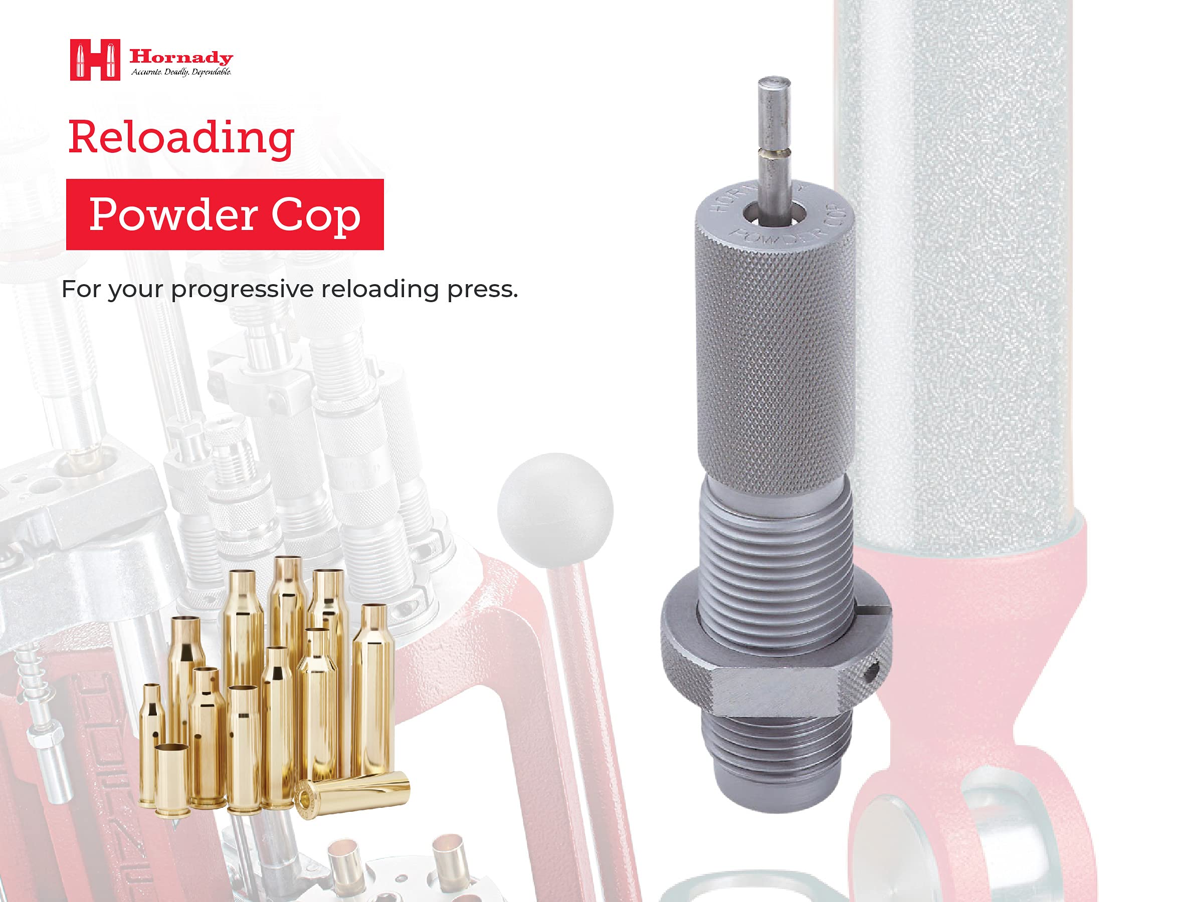 - Hornady Powder Cop – Install on your progressive press after the powder drop station to automatically check dropped charges. Monitors over charge and under charge