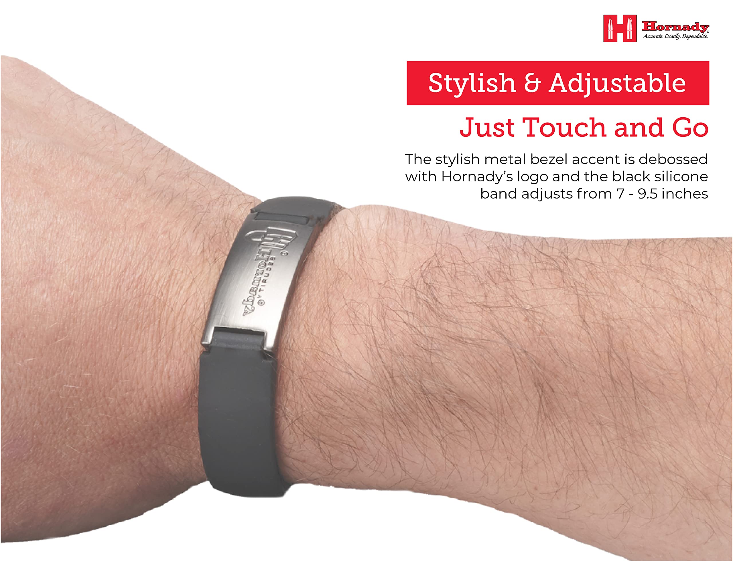 - Stylish and Adjustable - the stylish metal bezel accent is debossed with the Hornady logo and the black silicone band adjusts from 7 - 9.5 inches